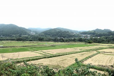 | 115系車内から。田園の彼方に上越新幹線の高架。(2013年7月21日 金島〜祖母島) 2013年7月記 |