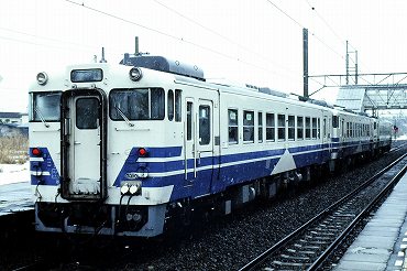 キハ40系。男鹿線カラーの車両も連結。(2002年3月6日 川部) 2022年2月記 |