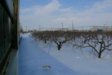 キハ40系より。雪景色の中、りんご畑が続きます。(2010年1月20日 川部〜藤崎) 2012年12月記 |