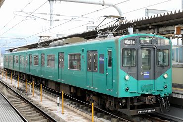 103系のラッピング車両。芸術家の横尾忠則氏が沿線の西脇市出身ということでのデザインだそうですが、けばけばしいだけにしか見えません。(2009年8月8日 加古川) 2013年7月記 |