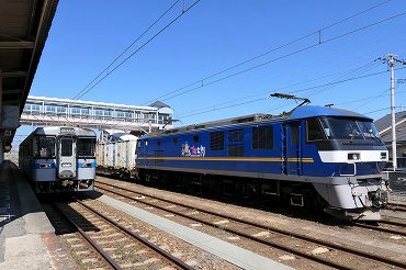 | 1000系の阿波池田行きに乗って佃へ行きます。横にはEF210の引く貨物列車。(2022年4月8日 多度津) 2026年2月記 |