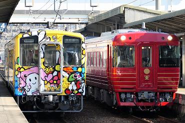 | キハ54系の宇和島行きとキハ185系の松山〜伊予大洲間「伊予灘ものがたり」。(2022年4月8日 松山) 2026年2月記 |