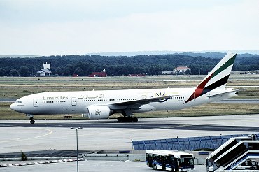 | エミレーツ航空のB777-200、A6-EMJがドバイから到着。この機体はロシアのVIMエアラインズへ売却されましたが引退しました。ターミナル1の展望デッキより。(2000年7月9日 フランクフルトFRA) 2024年11月記 |