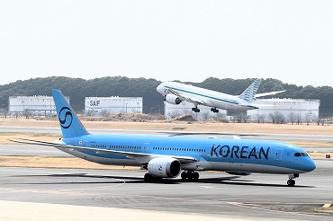 | B787-10、HL8515が仁川から到着。手前は系列のLCCジンエアー。ターミナル1の展望デッキより。(2024年12月27日 成田NRT) 2025年1月記 |