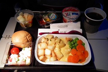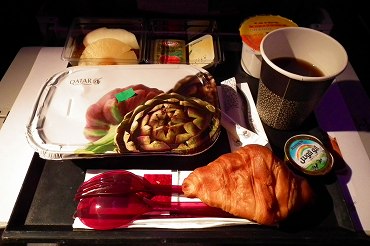 | B777-200LR、A7-BBI機内。成田〜ドーハ間1回目の機内食。(2014年6月5日) 2016年9月記 |