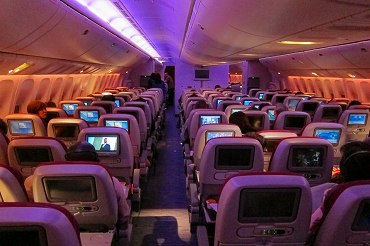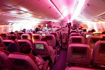 | B777-200LR、A7-BBF機内。ドーハから成田に向かっています。赤っぽいのは夜の照明。(2014年6月16日) 2016年9月記 |