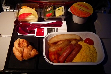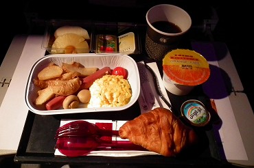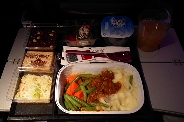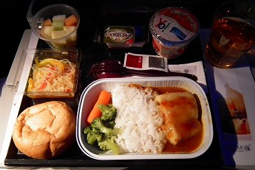 B777-200LR、A7-BBB機内。成田〜ドーハ間の2回目の機内食。(2013年11月6日) 2016年9月記 |