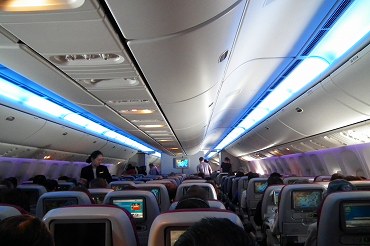 | B777-200LR、A7-BBF機内。ドーハから成田に向かっています。青っぽいのは朝の照明。(2014年6月16日) 2016年9月記 |