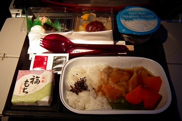 B777-200LR、A7-BBB機内。成田〜ドーハ間の1回目の機内食。(2013年11月5日) 2016年9月記 |