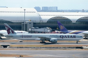 B777-300ER、A7-BAMがドーハから到着。展望デッキより二重のガラス越し。(2012年2月23日 バンコクBKK) 2016年9月記 |