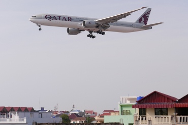 B777-300ER、A7-BAEがドーハから到着。空港周辺のプラサットラスゲストハウスの外階段より。(2019年1月9日 プノンペンPNH) 2019年1月記 |