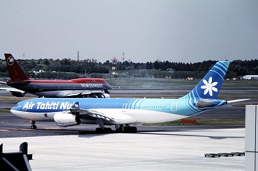 エア タヒチ ヌイのA340-300、F-OJGFがパペーテから到着。ターミナル2北側の展望デッキより。(2010年5月17日 成田NRT) 2016年5月記 |