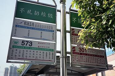 バス停。上段は空港バスの案内で時間が記されています。明日乗るバスの確認です。(2000年4月16日 上海駅) 2026年2月記 |