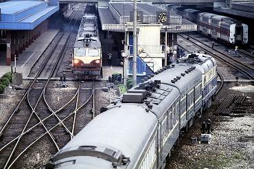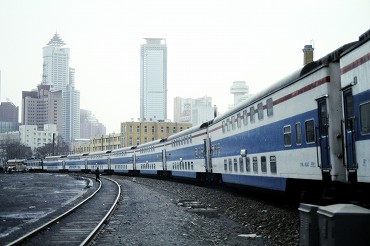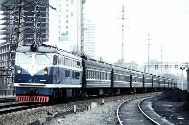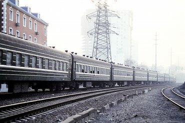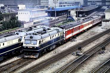 東風4B型ディーゼル電気機関車の引く2階建て客車が到着。(2000年4月13日 大連) 2025年12月記 |