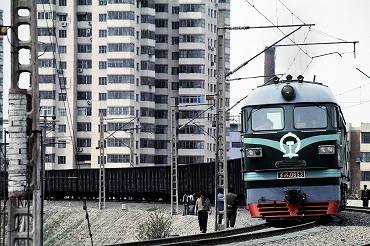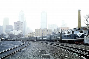 | 東風4D型ディーゼル電気機関車の引く列車が出発。(2000年4月13日 大連) 2025年12月記 |