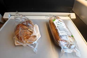 | ブラガ行きに乗ってサンタアポローニャからコインブラへ向かっています。売店でサンドイッチ(右)2.7EUR、チョコクロワッサン(左)2.4EUR。(2025年9月7日) 2025年10月記 |