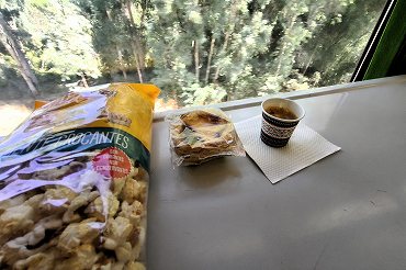 | インターシティに乗ってオリエンテからファロへ向かっています。ビュッフェ車両。コーヒー、タルト、ポップコーンで合計5.75EUR。(2025年9月15日) 2025年10月記 |