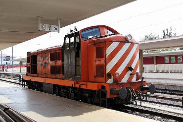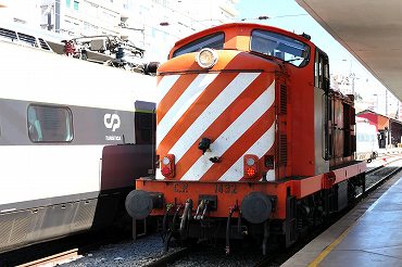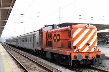 入換用ディーゼル機関車がギマランイス行きインターシティを推進で入線させました。(2025年9月5日 サンタアポローニャ) 2025年10月記 |