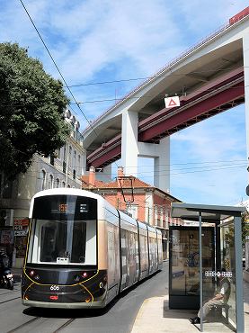 | 15系統フィゲイラ広場行き。後方の高架は4月25日橋へ続く道。(2025年9月6日 カルヴァーリオ) 2025年10月記 |
