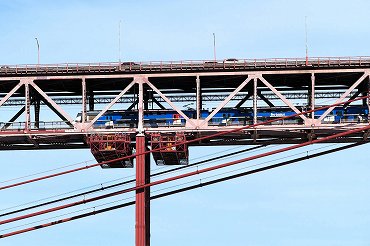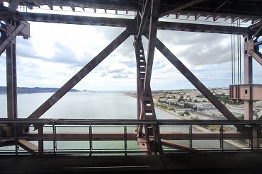 | フェルタグスのフランス製2階建て電車で運行するセトゥーバル行きに乗ってローマ・アレエイロからプラガルへ向かっています。テージョ川に架かる4月25日橋を通過中。(2025年9月7日) 2025年11月記 |
