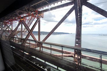 フェルタグスのフランス製2階建て電車で運行するセトゥーバル行きに乗ってローマ・アレエイロからプラガルへ向かっています。間もなくテージョ川に架かる4月25日橋を渡ります。(2025年9月7日) 2025年11月記 |