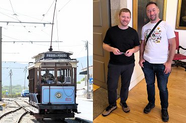 シントラトラムに乗ってシントラからマサス海岸へ到着。折り返しシントラ行きに。 右の2人はチェコから来ていた鉄道ファン、翌々日、ポルトでばったり遇いました。(2025年9月9日 マサス海岸、9月11日) 2025年11月記 |