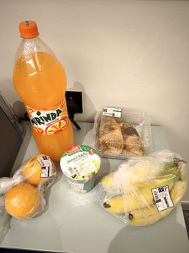 宿のそばのスーパーマーケットで飲料7.5QAR、パン2.5QAR、オレンジ2個2.44QAR、カップ麺2.75QAR、バナナ4本2.24QAR。(2026年1月7日) 2026年1月記 |