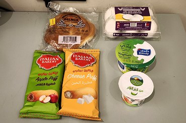 | 宿のそばのスーパーマーケットで上のパンは1QAR、下のパンは1個1.5QAR、玉子6個5.5QAR、ヨーグルトはどちらも1QAR。(2026年1月7日) 2026年1月記 |