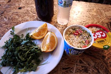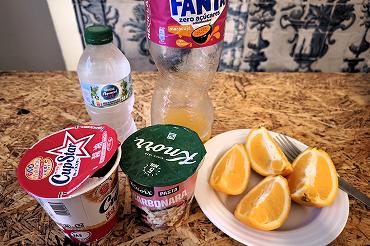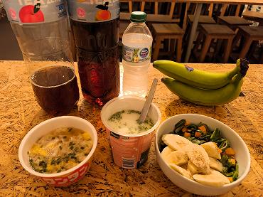 宿の共用スペースでスーパーマーケットで買ったものや持参の食料。(2025年9月7日) 2025年10月記 |