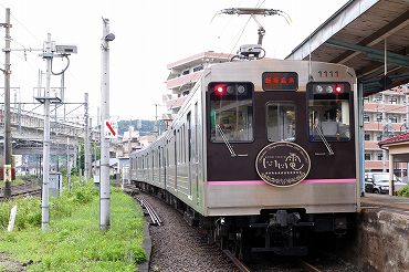 福島交通7000系2両。この車両は元東京急行電鉄。帯がピンクの車両もあるようです。(2013年8月9日 福島) 2013年8月記 |