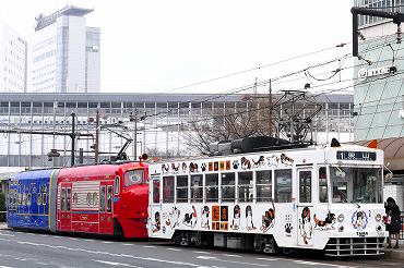 | 9200形「おかでんチャギントンリアル電車」と清輝橋線7900形の清輝橋行き。(2014年3月22日 岡山駅前) 2019年3月記 |